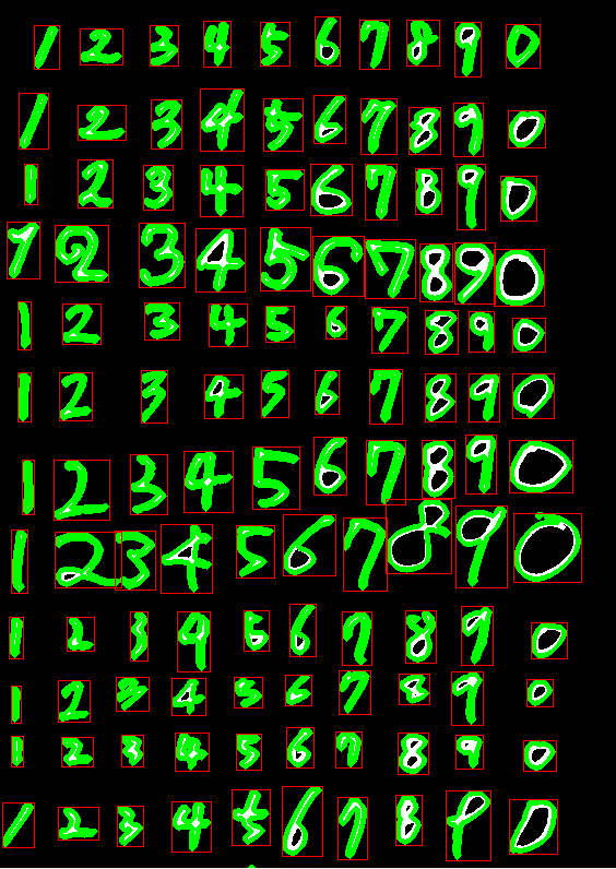 노이즈를 제거 한 뒤에 opencv 의 findContours를 이용하여 외곽선 검출을 한 다음, boundingRect를 통해 사각형을 그려주면 손글씨의 숫자대로 나누어 줄 수 있다.