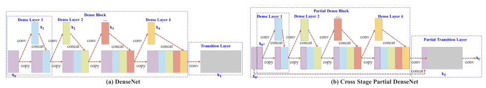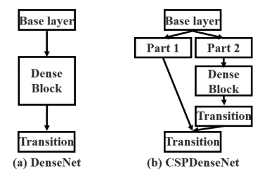 이 작업은 연산량을 크게 줄여주고, 정확도 향상과 inference time을 줄여주었다고 한다. 저자는 이 작업을 소개하기 위해 DenseNet에 CSP기법을 적용시킨 이미지로 소개하고 있다.