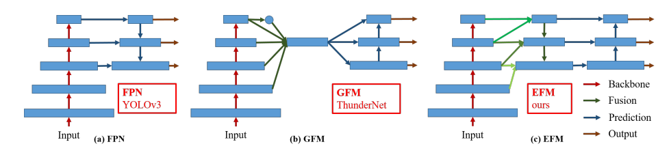 해당 이미지에는 3가지 detection neck이 나타나 있다. 피라미드를 이용하는 Yolo의 FPN(feature pyramid Net) (실제로 YOLO의 훈련 과정을 보면 iteration이 3가지의 크기로 진행되는 것을 확인할 수 있다.) ThunderNet(처음 본다..)에서 쓰인다는 GFM(Global fusion Model) 그림을 보면 layer의 feature들이 하나로 합쳐졌다가 세개로 나누어지는 것을 확인할 수 있다. 그리고 EFM(Exact Fusion Model 정확한 퓨젼 모델? ㅋㅋ..) 에서는 두가지의 구조를 섞어서 좀더 balance하게 연산을 할 수 있게 유도하는 것을 알 수 있다.