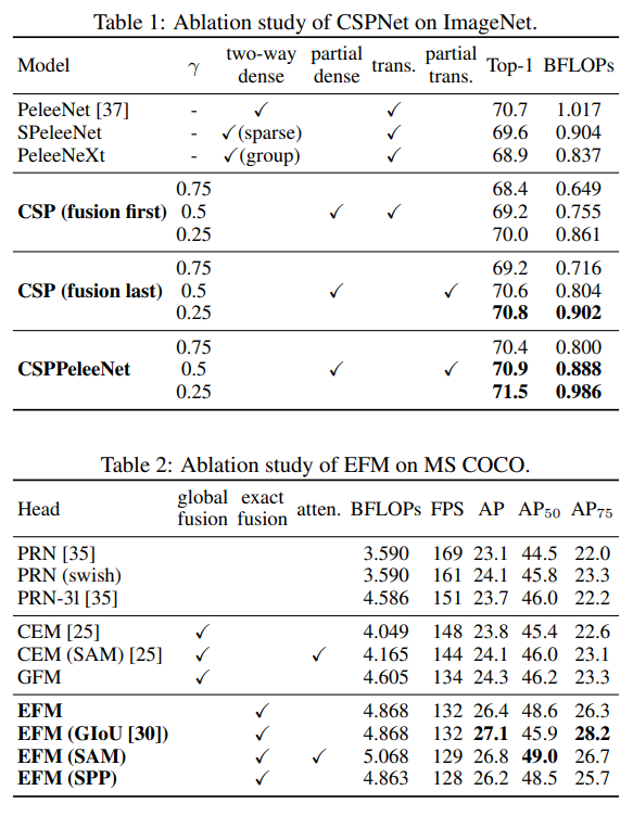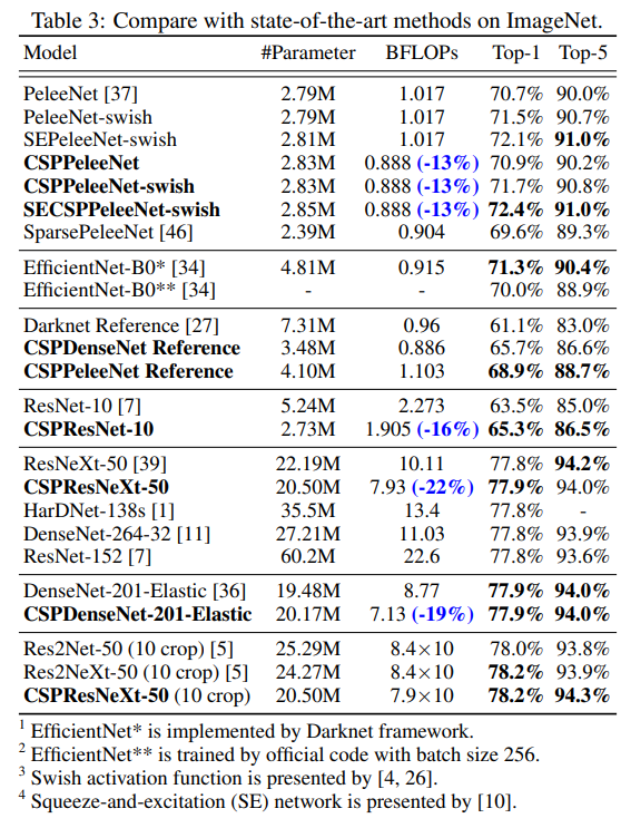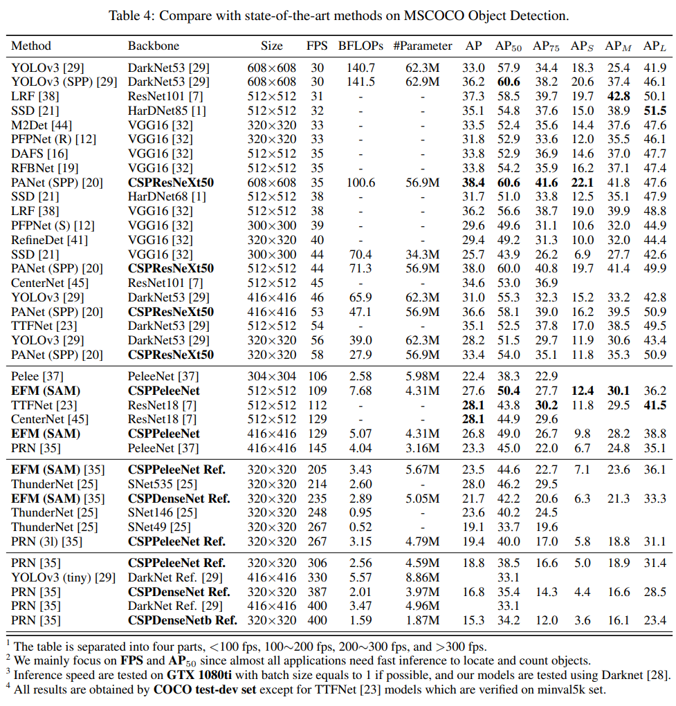 여기까지가 CSPNet논문의 모든 이론적인 내용이다 그 밑은 실험에 대한 내용인데, 말하자면 자랑글이다. 뭐 어떤 부분에서 성능이 향상되고 메모리 cut down됬고 등등, 실험에 대한 자세한 내용은 논문을 직접 확인하도록 하고 이 포스팅에서는 딥러닝 자랑글에 늘 올라오는 표들을 슥~ 봐보도록 하자.